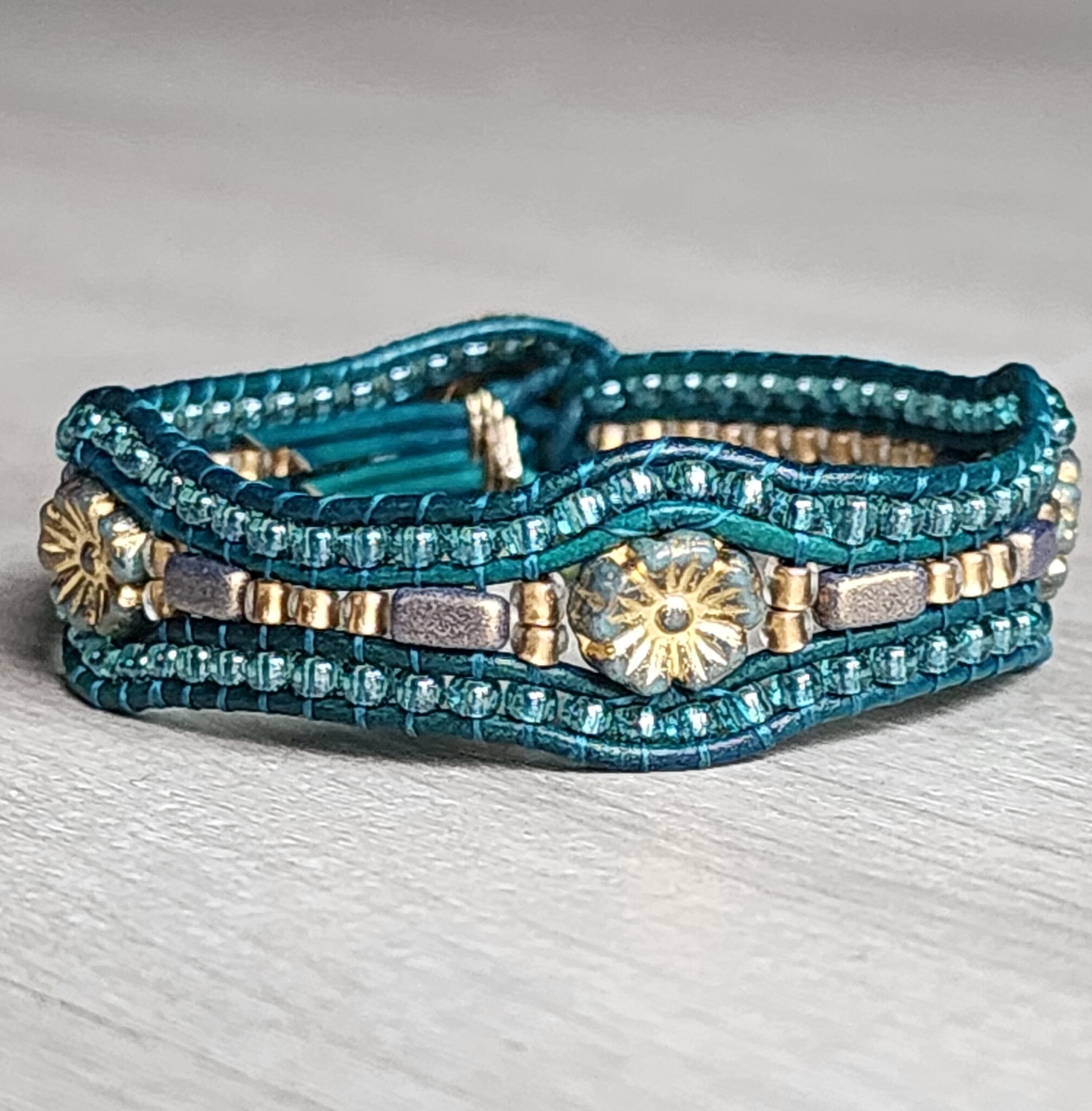 Three green hibiscus Czech glass flowers dance around your wrist on leather cord. The undulating shape is smile material. Great gift for that unique person on your list!!