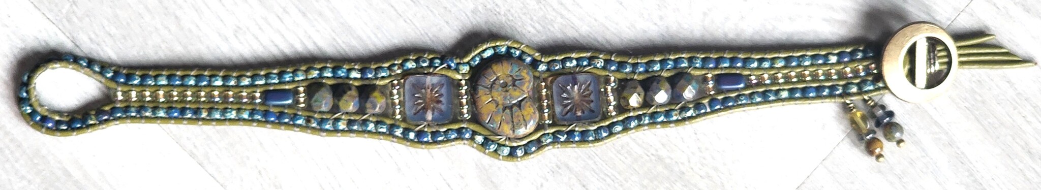 Indulge yourself in this Czech glass Ammonite bracelet in smoky olive and blue tones.